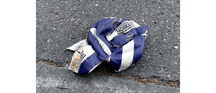 One half of a pair of flip-flops. This one is the flip. A Ugg kid’s boot, no reflection on the kid. The cap is a Lincoln Electric Welder’s beanie. It’s probably fireproof, but we didn’t check.