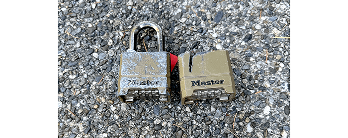 A while back, we found a combination padlock shown on the left in the above photo. By watching some YouTube videos, we were able to determine the combination and reset it to ‘1-2-3-4’ until we can find a use for it. Today, we found the one on the right that someone without the combination destroyed the lock to get it open. Did they even try ‘1-2-3-4’?