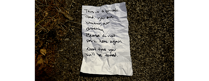 We have found several of these notes, mostly crumpled on the ground like this one. The best one was a similar one from an apartment. Below, the perp scribbled, “No.” Then crumpled it and tossed it on the ground.