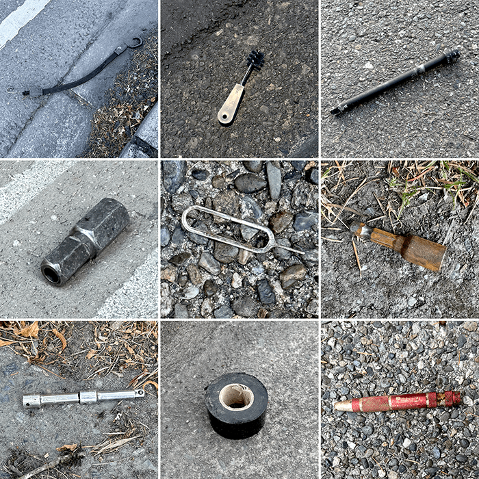 A bungee cord, a wire brush, a drill extension, two drill bits, two socket extensions, and a roll of tape. And yes, the tape could get a bit sticky with judges. The item in the center is a phone SIM card removal tool, basically a glorified paper clip. Finally, the item at the bottom right is a Pittsburgh Automatic Center Punch, but it has been run over, and the end cap is gone, losing the punch heads. So, frankly, it’s lost its punch.