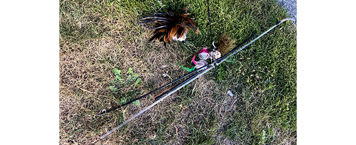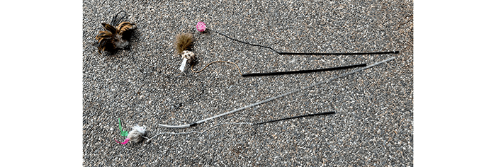 But we were wrong. After some untangling, we found a set of cat toys, complete with feathery distractions, furry puffs, sparkly streamers, and a bell.