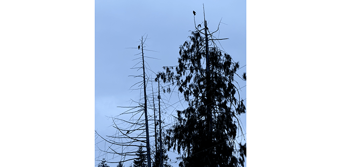 As we looked around, we saw that there were many more crows in the trees and more flying in. We guessed that there were an excess of a hundred crows creating a cacophony of noise. Then we saw the reason.