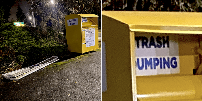 We have written about these containers before. They are a good idea, but people take it an excuse to just dump anything nearby. Case in point: someone dumped some used fluorescent light fixtures.